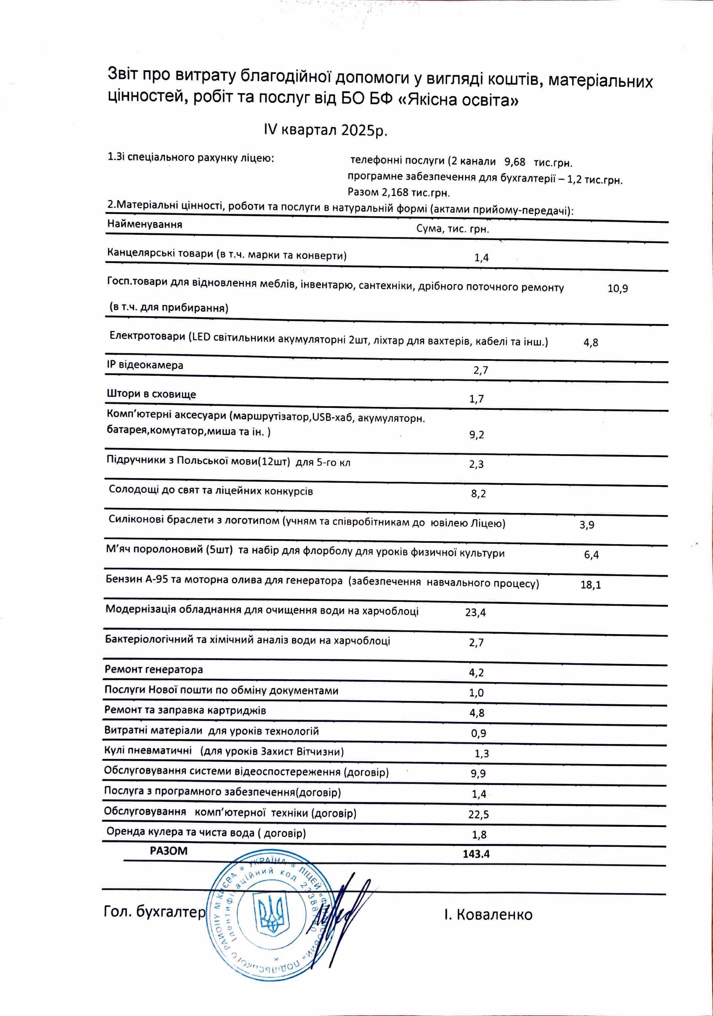 Звіт про надходження від благодійного фонду "Якісна освіта" за ІІІ квартал 2025 року